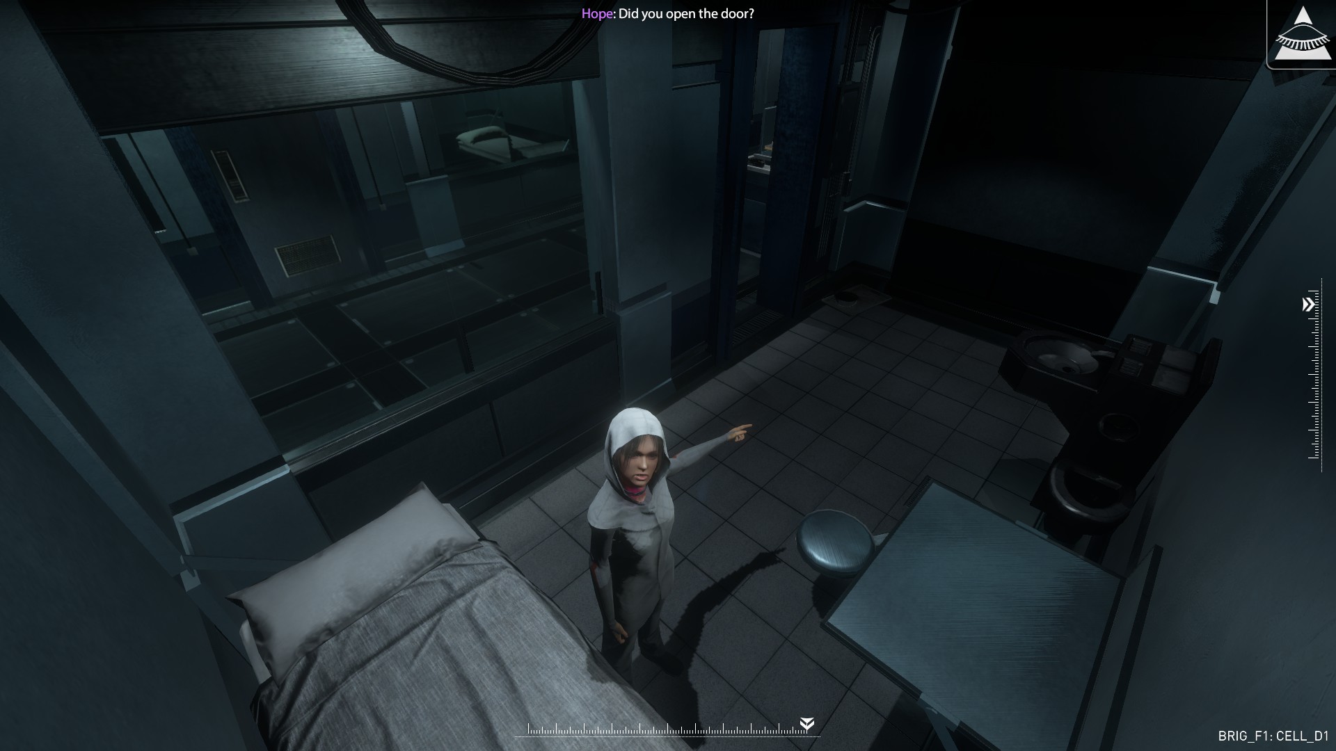 As Hope attempts to escape Metamorphosis, the player, having taken the role of a helpful disembodied observer, assists her by jumping between the security cameras nesting in every corner of the facility. Positioned as an all-seeing guide, the player/cameras are able to lead her past guards or through computer-locked doors. On her own, Hope is essentially human–only capable of seeing what’s immediately in front of her and unable to manipulate the systems that lock jail cells and gate off the areas she needs to access. With the assistance of the player’s omniscient camera control, though, she becomes more than an individual. Like the oppressors who keep her captive through constant monitoring, she can use technology to become more powerful than any single person could otherwise be. The player helps her to distract a guard by causing a telephone to ring, allowing Hope to slip through a hallway unobserved; s/he checks patrol routes by swapping between camera feeds, finding opportunities for Hope to sneak past.