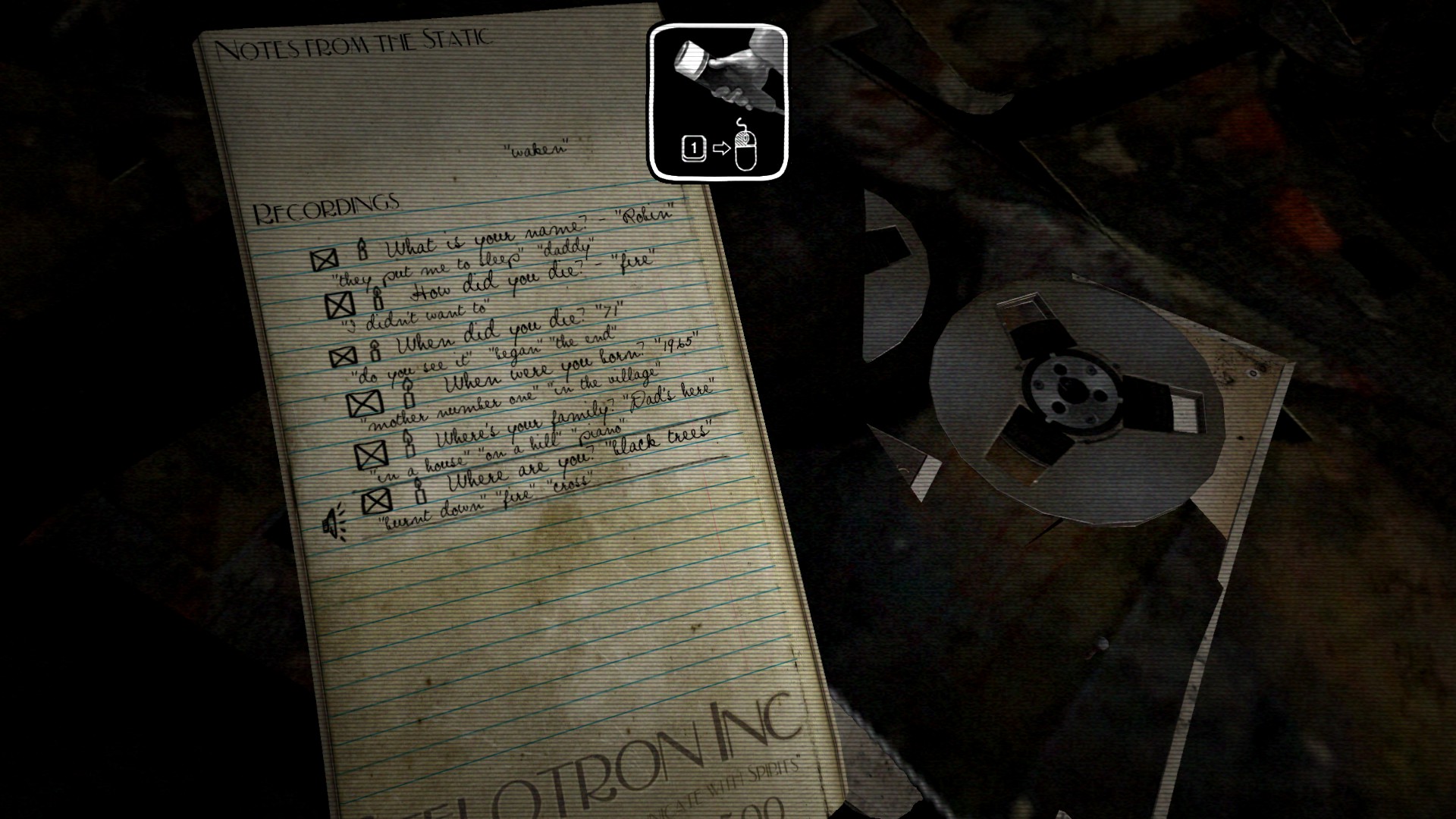 As the player works their way through dark forests, derelict buildings, and crumbling old houses, they pick up hints by aiming their microphone in the direction of ghosts (some recently pacified, in blasts of jarring distortion, by the retrofitted potato gun that serves as the game’s only weapon). After enough paranormal sound has been recorded, the screen switches to a view of Juliette’s notebook and tape set. From here, a garbled sample must be manipulated so that words can be made out. Islands of disconcerting sound poke out of the reels’ wash of static, the player scrubbing through it at various speeds, backwards and reverse, until something roughly legible can be teased out.